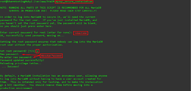 Kita pasang atau install database untuk wordpress dengan perintah mysql_secure_installation > tekan enter > ketikan Y > kita akan buat password untuk root mysqlnya dan masukan konfirmasi passwordnya.